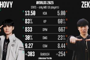 体育资讯10月28日讯 S15八强赛今日将迎来HLE对阵GEN的比赛,赛前外媒分享两队中单数据对比。