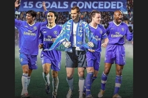 切尔西球迷号通过社媒晒照:“单赛季仅丢15球,令人难以置信,我们的队长、领袖、传奇@约翰·特里领衔缔造的纪录依然无人打破。特里还会提及,在他和切赫同时在场时仅丢了13球。”蓝军传奇队长约翰·特里也在赛后通过社媒转发了该动态。