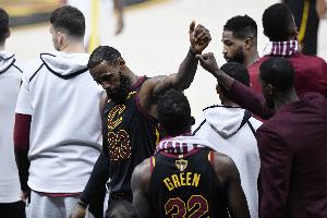 随后,詹姆斯带领骑士队进入了总决赛的第一场比赛——如果不是因为JR·史密斯在常规时间结束时的失误,以及在比赛还剩36秒时对金州勇士队凯文·杜兰特的一次阻挡犯规(导致勇士获得两分而不是一次进攻犯规失误),他们本可以赢得那场比赛。