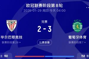 体育资讯01月29日讯 欧冠联赛阶段末轮,葡萄牙体育客场3-2逆转战胜毕尔巴鄂,最终排名第七直通欧冠16强。
