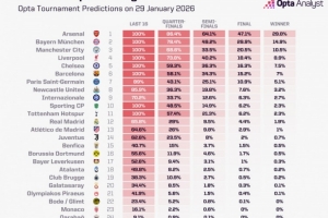 体育资讯1月30日讯 欧冠联赛阶段已经结束了全部争夺,除了已经被淘汰的8支球队外,OPTA对剩余球队的夺冠概率进行了预测,阿森纳以29.8%居首,拜仁以14.9%位居次席。