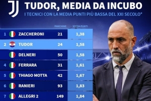 体育资讯10月28日讯 德转统计表明,图多尔执教尤文场均1.58分,是21世纪场均积分并列第二少的尤文教练。