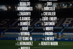 中场:17-维蒂尼亚、19-李刚仁、24-马尤卢、27-德罗、33-扎伊尔·埃梅里、87-若昂·内维斯