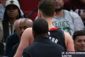 GIF-申京被队友推着离场,自己还在喋喋不休!