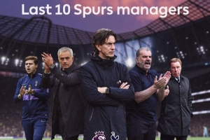 英超官方将热刺最近十任主帅的联赛带队成绩进行了对比,托马斯·弗兰克胜率26.92%垫底。