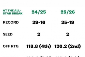 布朗晒出上赛季和本赛季凯尔特人在全明星假期时的战绩和各项数据对比。