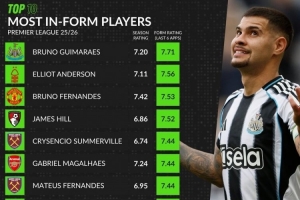 体育资讯2月14日讯 whoscored统计了英超球员近期评分,吉马良斯、安德森和B费分列前三。
