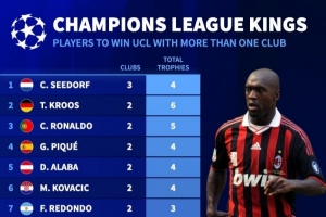 体育资讯2月16日讯 德国转会市场列出了随不同俱乐部赢得欧冠的球员榜单,西多夫、克罗斯、C罗、皮克在列。
