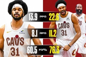 本赛季无哈登时,贾勒特·阿伦场均13.9分8.1篮板,投篮命中率60.5%,真实命中率64.5%;