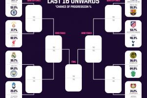 体育资讯02月27日讯 OPTA超算对欧冠1/8决赛进行了10000次模拟,各组对阵晋级概率如下。