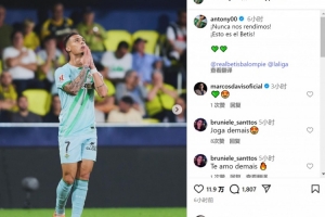 安东尼社媒晒出庆祝进球的照片,配文:“我们永不言弃,这就是贝蒂斯!”