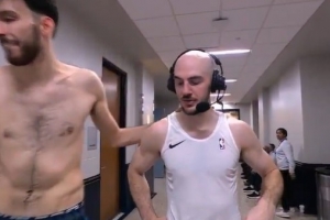 赛后卡鲁索接受ESPN采访,霍姆格伦光着膀子路过。巴克利调侃道:“告诉切特穿上衣服。他的身材还不够好,不配光着膀子到处走。”