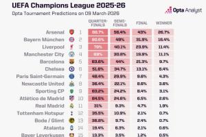 体育资讯03月09日讯 OPTA对欧冠剩余赛程进行了10000次模拟,并为每阶段比赛分配了获胜概率。各球队最终夺冠概率如下。