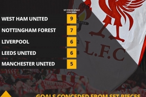 根据OPTA的数据统计,本赛季英超中仅诺丁汉森林(9球)和西汉姆联(7球)比利物浦(6球)在定位球方面丢球更多,而诺丁汉森林和西汉姆联均身处降级区。另外,利兹联在定位球丢球方面和利物浦同样多,曼联则丢了5球。