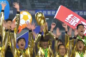 赛后颁奖环节,泰州队全队身着金色战袍,捧起首届苏超冠军奖杯!