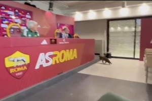 《罗马体育报》晒出的视频显示,当加斯佩里尼回答记者提问时,一只猫闯进了新闻发布厅。这只猫咪恰好就在加斯佩里尼发言的讲台附近开始喵喵叫,教练关于本赛季阵容可能调整的论述被猫叫声打断。