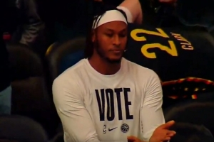 此役,雄鹿中锋迈尔斯-特纳重返步行者主场,但遭到老东家球迷的漫天嘘声,对此,特纳面对镜头做了一个合上书的动作。