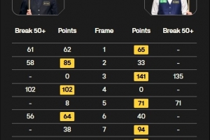 斯诺克球员锦标赛16进8轮次:希金斯6-1淘汰罗伯逊,晋级8强