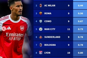 体育资讯10月21日讯 德转盘点了五大联赛球队本赛季至今场均最少失球榜单(各项赛事),其中阿森纳场均丢0.27球最少,具体如下: