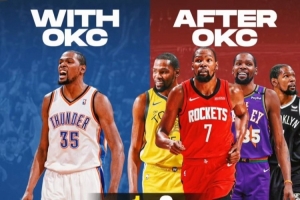 杜兰特雷霆生涯1次MVP、0冠军、总得分17566;后雷霆生涯杜兰特0次MVP、2冠军、总得分12955。