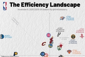 体育资讯11月7日讯 今天,数据专家Kirk Goldsberry更新了本赛季球队的攻防效率值表。
