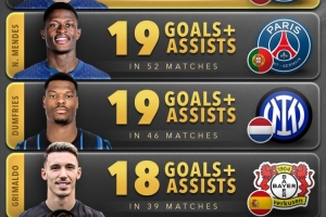 2025年五大联赛后卫参与进球榜: