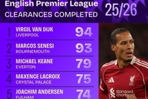 体育资讯11月11日讯 英超联赛已经进行了11轮,squakwa也统计了本赛季英超解围次数,范戴克力压塞内西居首。