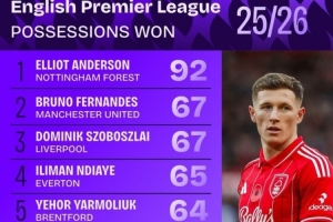 体育资讯11月11日讯 英超联赛已经进行了11轮,squakwa也统计了本赛季英超赢得球权次数,埃利奥特-安德森断崖领跑。