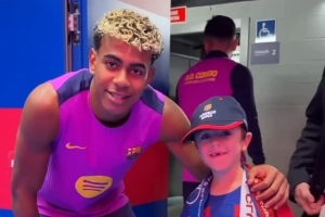体育资讯11月11日讯 巴萨上周五在诺坎普进行了公开训练,阿劳霍带着一位患病小球迷见亚马尔。