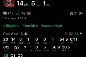 他上半场多次在打不开局面的情况下强行解决问题,20分钟的时间里,投篮11中6,三分球2中0,罚球2中2,拿下全队最高的14分外加5篮板1助攻的数据,正负值+7。