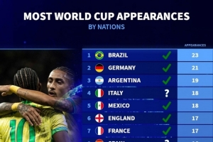 各国参加世界杯次数排名(含2026年世界杯):