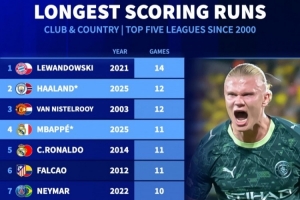 体育资讯10月22日讯 曼城在本轮欧冠2-0客胜黄潜,哈兰德各项赛事连续12场破门,距离莱万保持的新世纪纪录也已不远。
