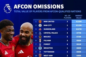 英超各队晋级非洲杯决赛圈球员身价排名: