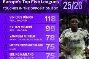 体育资讯11月21日讯 五大联赛战火即将重燃,数据机构squakwa也统计了本赛季至今的五大联赛球员在对方禁区内触球次数情况,维尼修斯力压队友姆巴佩居首。