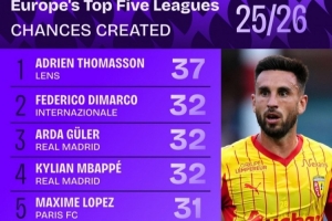 体育资讯11月22日讯 五大联赛战火即将重燃,数据机构squakwa也统计了本赛季至今的五大联赛球员创造机会次数情况,朗斯中场阿德里安·托马森居首。