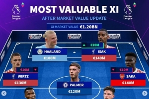 体育资讯10月18日讯 德转在本月17日更新英超球员身价,同时列出英超球员身价最贵阵,哈兰德、维尔茨、伊萨克在列,总身价达12亿欧。