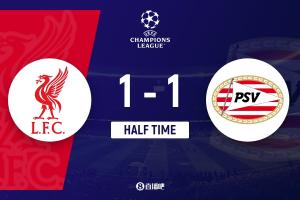 上半场伤停补时1分钟,半场结束,利物浦暂1-1埃因霍温。
