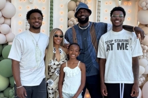 湖人前锋詹姆斯的小儿子布莱斯更新Instagram Story,晒出一张詹姆斯全家五口人的合影,并写道:“感恩❤️”