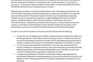 2. 建议所有国际体育联合会不要在印度尼西亚举办任何国际体育赛事或会议,直到印度尼西亚政府向所有国际体育联合会提供充分保证,允许所有参与者无论国籍如何,都能进入该国。