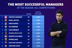 体育资讯11月28日讯 本赛季五大联赛中,拜仁和阿森纳均有着极为出色的表现。德国转会市场盘点了五大联赛主帅场均拿分情况,孔帕尼、阿尔特塔和阿隆索位居前三。值得一提的是,这三名主帅都是名副其实的少壮派。