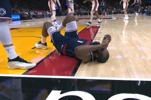 上半场一次进攻中,哈登突破后摔倒,躺在地上表情痛苦,裁判没有吹罚,后续是祖巴茨在篮下被犯规。