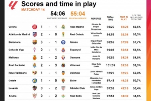 1.赫罗纳1-1皇马 98分20秒 净时间62分26秒