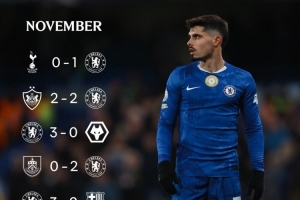 切尔西在11月参加6场比赛,战绩4胜2平保持不败,切尔西官方社媒晒出战绩海报,配文:“11月不败。”