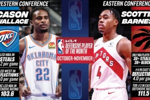 体育资讯12月3日讯 今日NBA官方公布了10-11月东西部月最佳防守球员,雷霆球员卡森·华莱士和猛龙球员斯科蒂·巴恩斯分别当选。