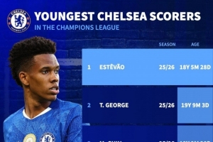 体育资讯10月23日讯 本轮欧冠比赛,埃斯特旺、乔治、吉乌破门,切尔西5-1击败阿贾克斯。德国转会市场列出了切尔西队史欧冠最年轻进球者排名,埃斯特旺、乔治、吉乌排名前三。