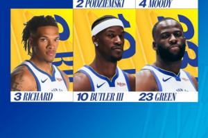 勇士首发:波杰姆斯基、穆迪、理查德、巴特勒、追梦。