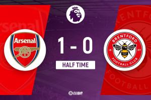 上半场补时3分钟,阿森纳1-0布伦特福德。