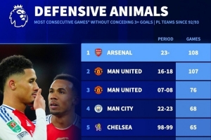 92-93赛季以来英超球队连续失球少于3粒比赛场次纪录: