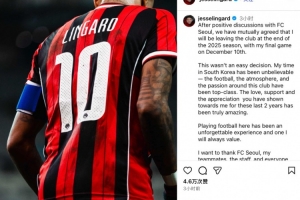 体育资讯12月5日讯 今日,首尔FC官方宣布林加德将在赛季结束后离队,随后林加德也在社媒发文,告别首尔FC。
