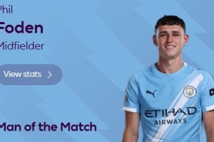 赛后,英超官方确认福登当选本场比赛的MVP。